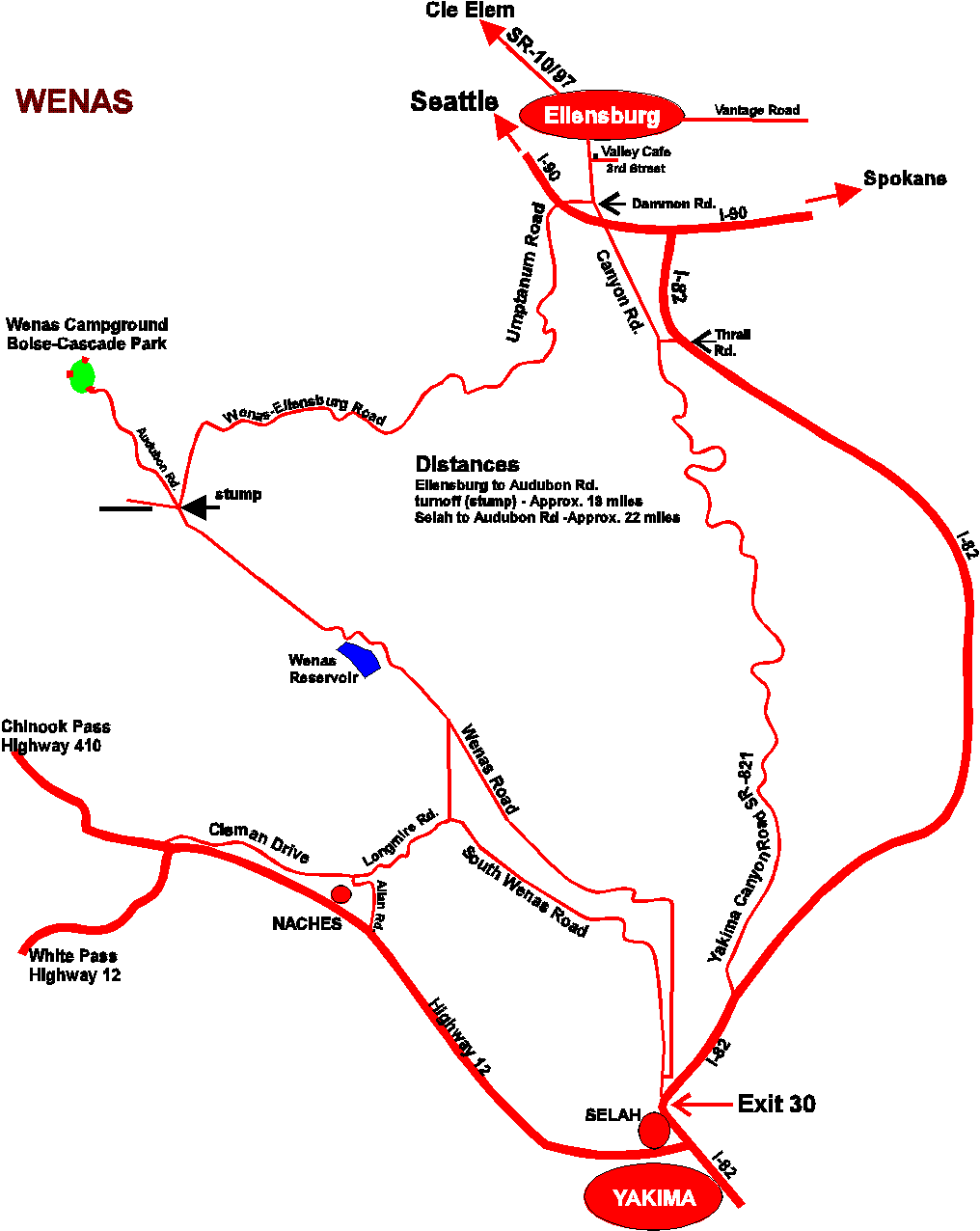 You will need both Yakima and Kittitas County maps to cover the areas around Wenas Creek. The campsite is located in Yakima County just below the Kittitas County line, on land managed by DNR. Some of our field trips go on public land–USFS, Wenatchee NF, WDFW, DNR and to the UW Astronomical Observatory on Manastash Ridge.